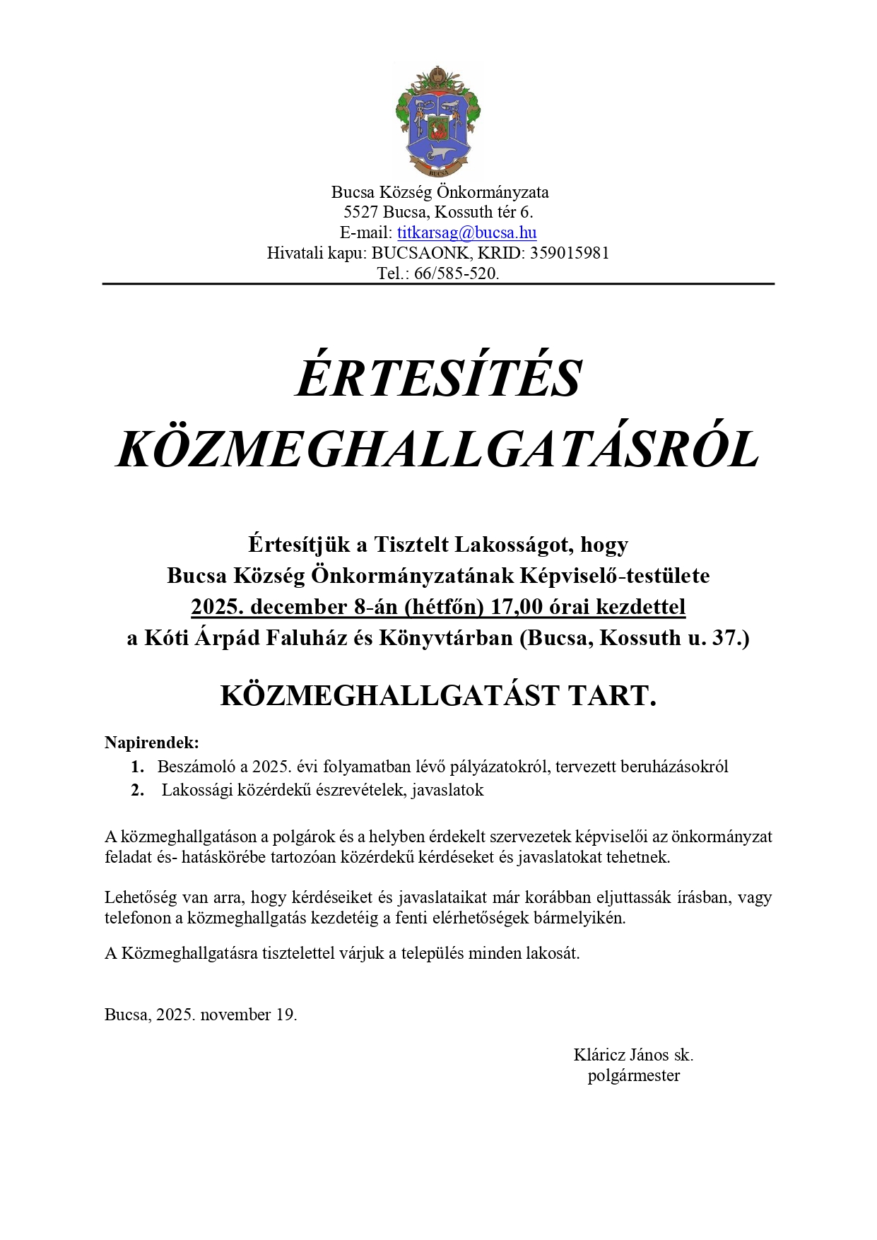 | Értesítés közmeghallgatásról 2025. december 8. hétfő 17,00 óra |